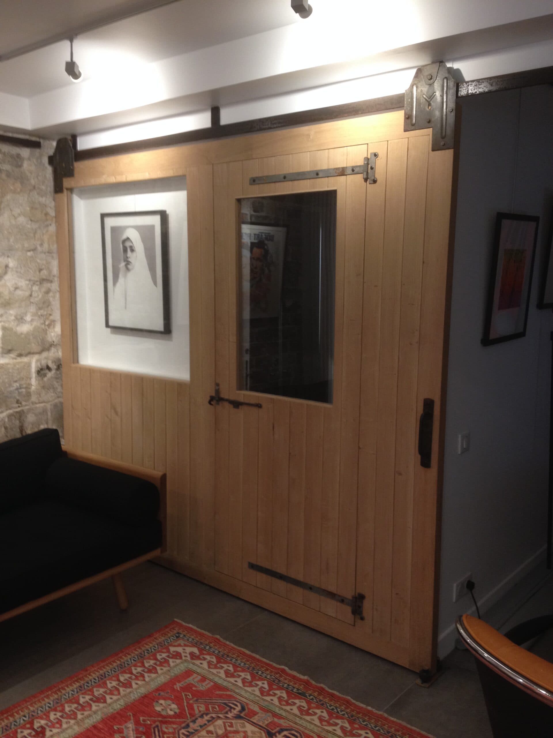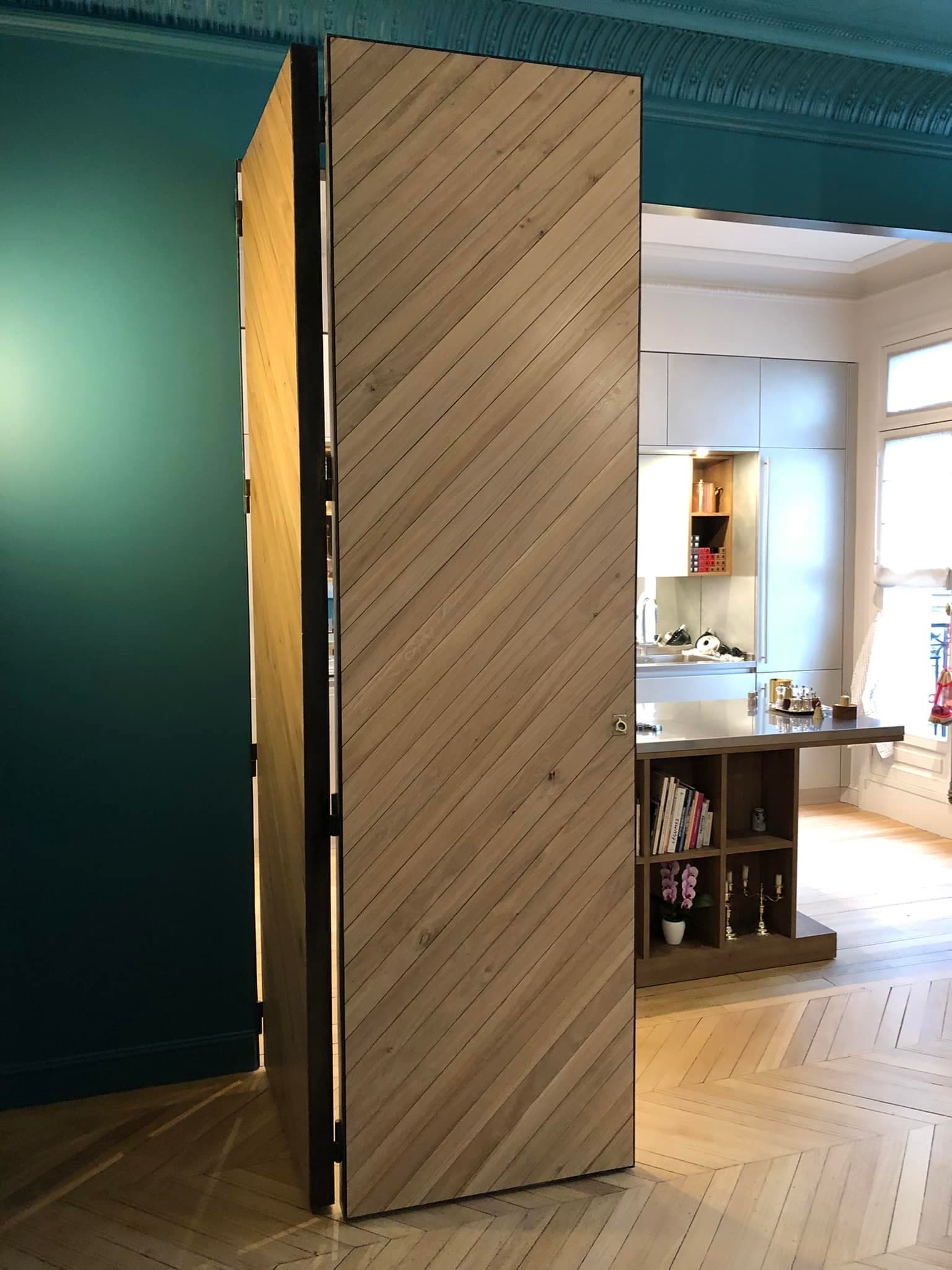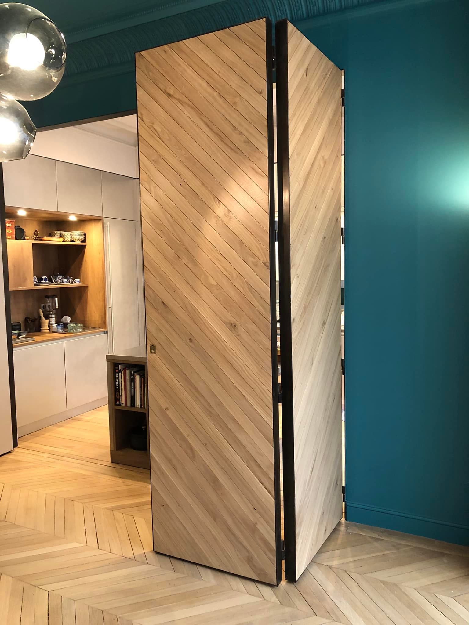 Séparation pièce : métal + lames chêne avec porte ouverte.