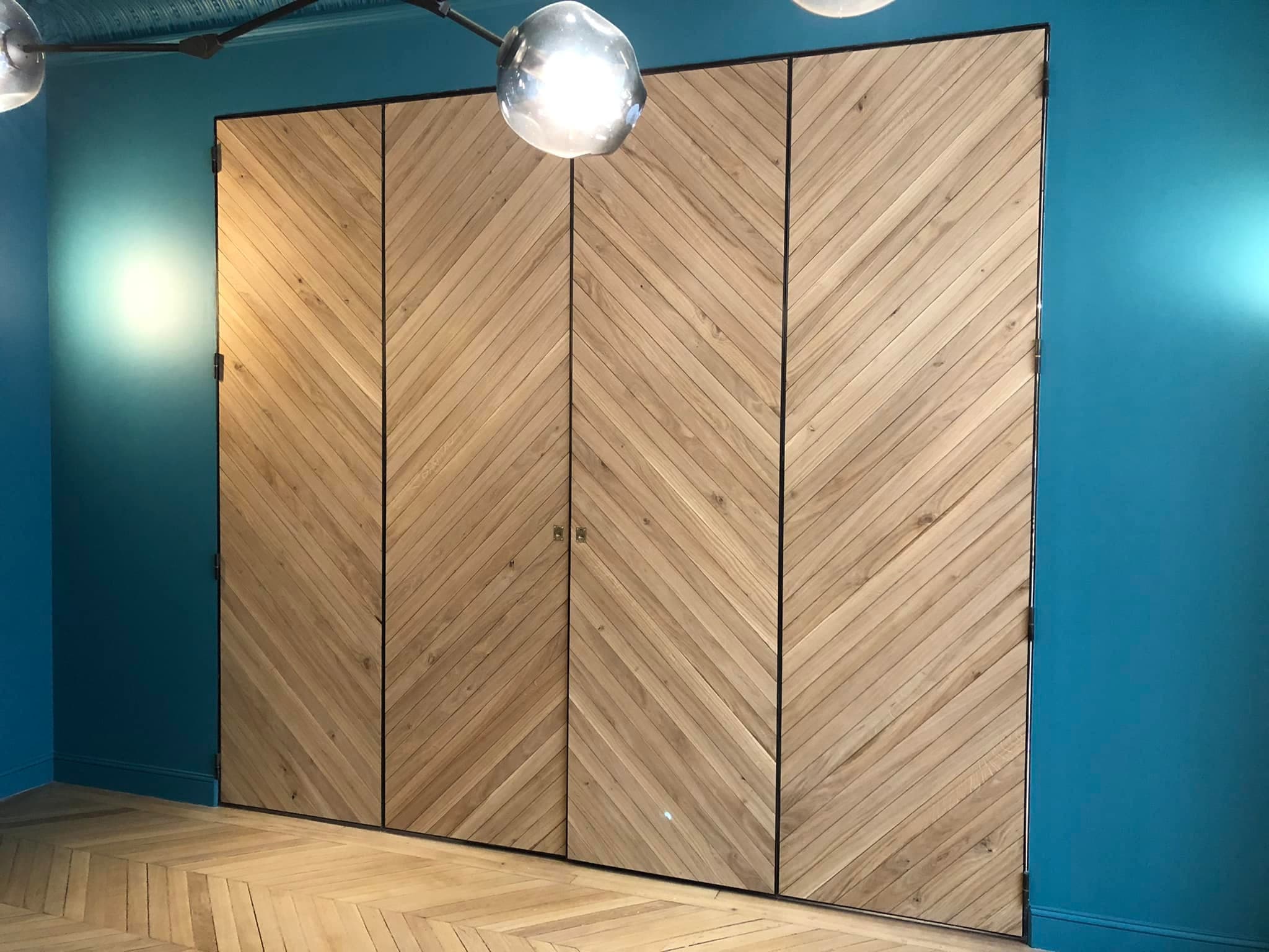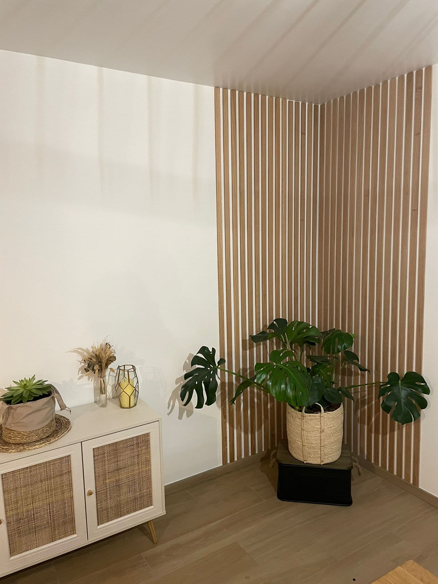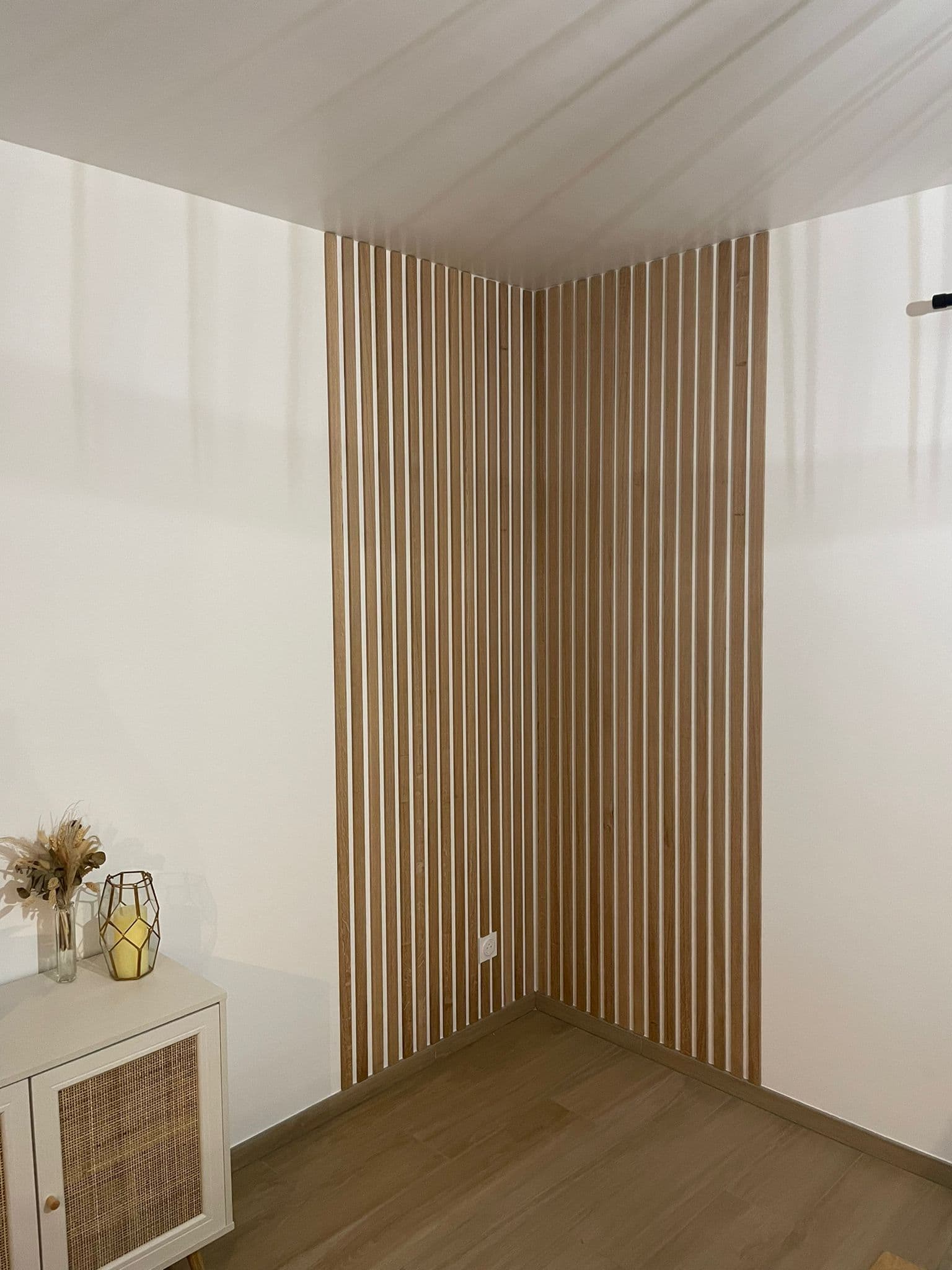 Séparation pièce : métal + lames chêne avec porte ouverte.